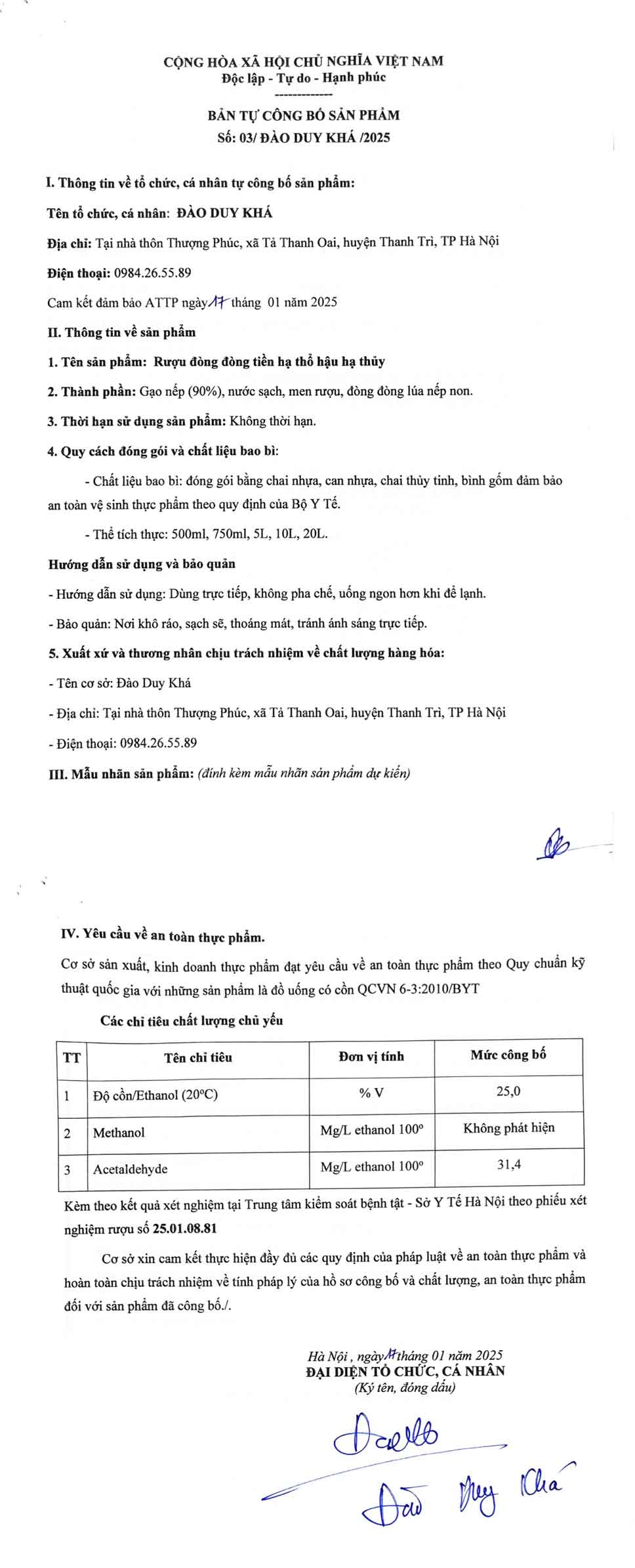 Xuất xứ: HKD Đào Duy Khá, Thượng Phúc, Tả Thanh Oai, Thanh Trì, Hà Nội